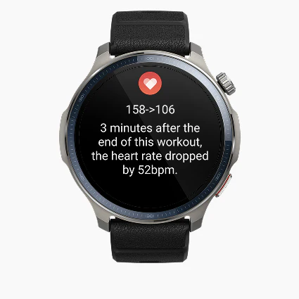 Regeneracja tętna po treningu (HRR) to kluczowy wskaźnik sprawności fizycznej, który mierzy, jak szybko tętno spada po wysiłku. Odzwierciedla on wydolność układu sercowo-naczyniowego i zdolność organizmu do powrotu do stanu spoczynku po wysiłku. Po zakończeniu treningu zegarek Amazfit monitoruje, o ile spada tętno w ciągu pierwszych 1–2 minut odpoczynku.